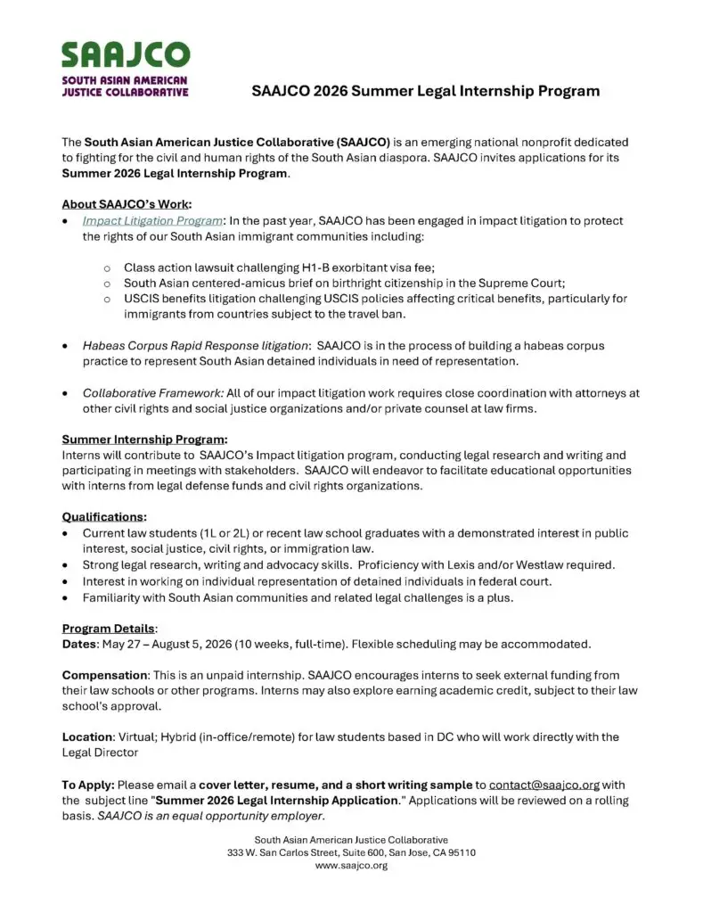 The South Asian American Justice Collaborative (SAAJCO) is an emerging national nonprofit dedicated to fighting for the civil and human rights of the South Asian diaspora. SAAJCO invites applications for its Summer 2026 Legal Internship Program.
