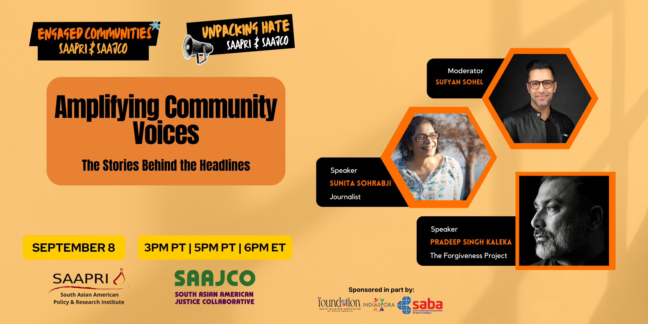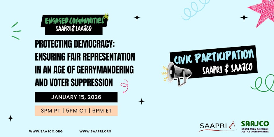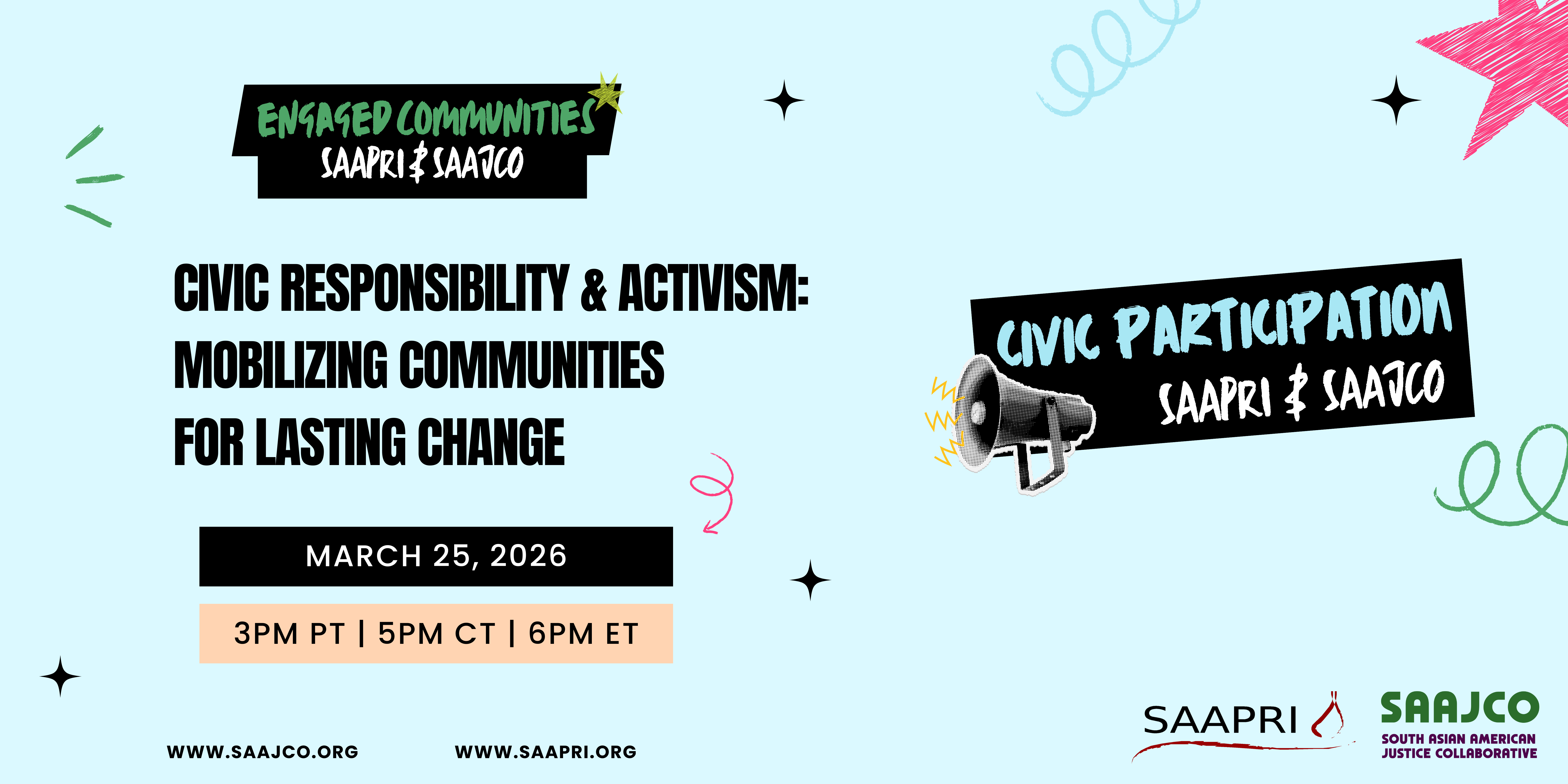 SAAJCO, in partnership with the South Asian American Policy & Research Institute (SAAPRI), presents the Engaged Communities Series—a multimedia initiative running from April 2025 to March 2026. This series features monthly webinars and podcast episodes exploring: